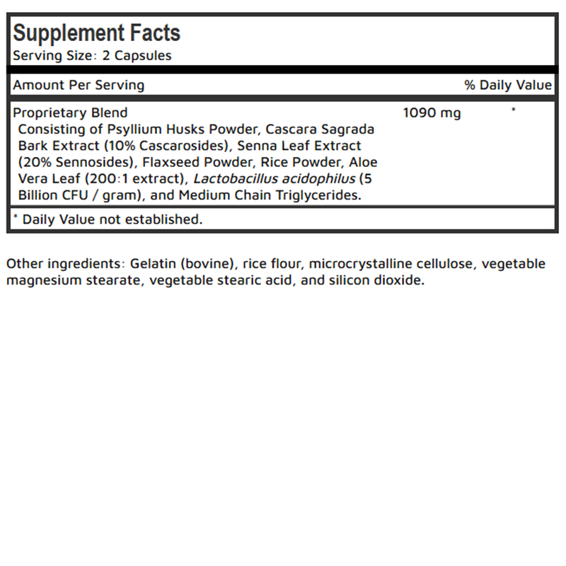 Psyllium Husk, Senna Leaf, and Cascara Sagrada support natural bowel movements and relieve occasional constipation by promoting healthy intestinal transit.