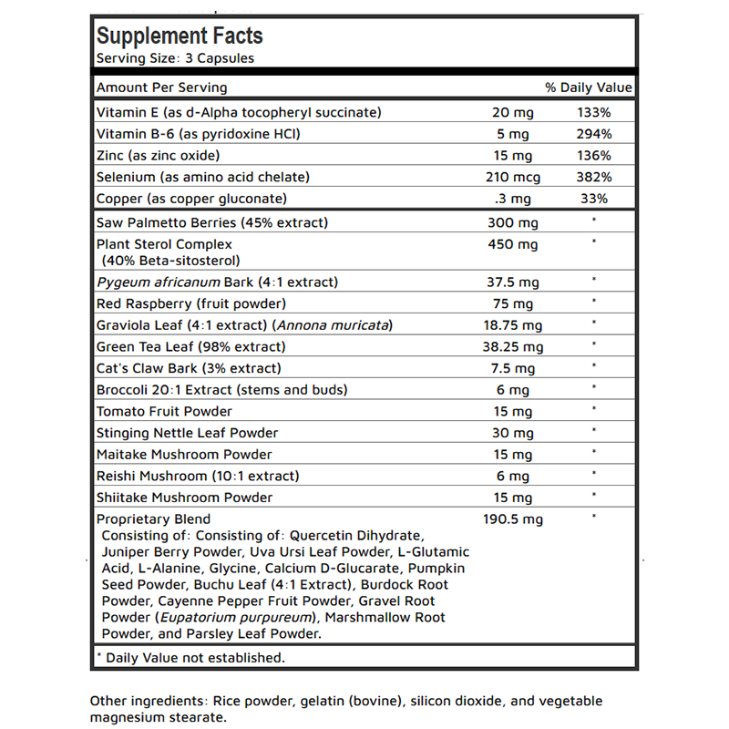 Saw Palmetto, Pygeum africanum, and Pumpkin Seed Powder are known to promote healthy prostate function and may help reduce symptoms of benign prostatic hyperplasia (BPH).